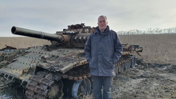 Jens Alstrup ved en kampvogn lige syd for Izjum.