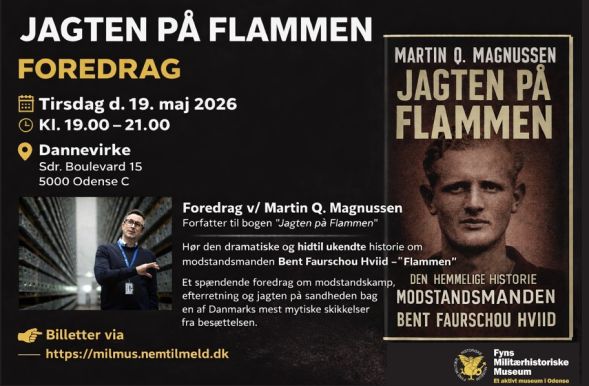 Kom og oplev et unikt foredrag, når Martin Quist Magnussen gæster Odense og åbner døren til en af besættelsestidens mest dramatiske og gådefulde skæbner: modstandsmanden Bent Faurschou Hviid – “Flammen”.